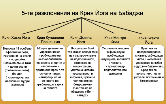 Крия Йога е научно изкуство за съвършено единение с Божията Истина и за Себеосъзнаване. Тя е възкресена от великия индийски Учител, Бабаджи Нагарадж, като синтез на древните техники произлизащи от традицията на 18 -те Сиддхи. Тя представлява серия от техники – „Крии“, групирани в пет разклонения.