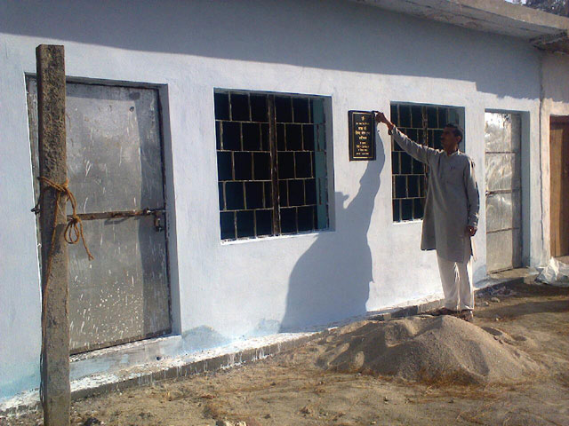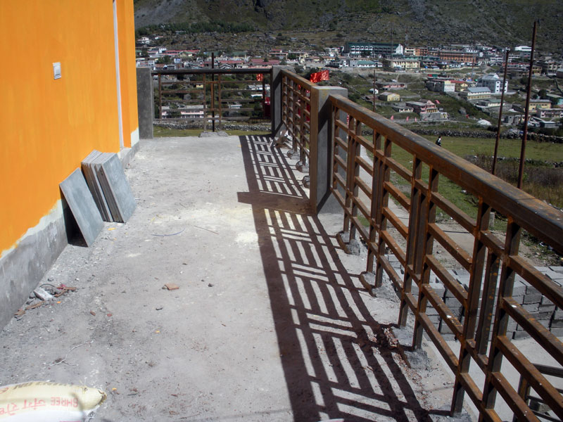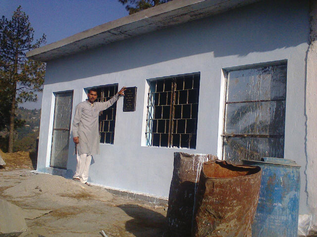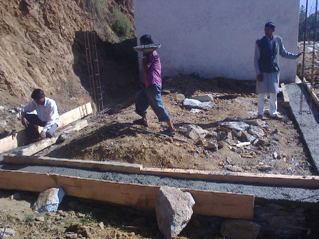 Istniejąca szkoła i sterta kamieni na budowę nowej sali
