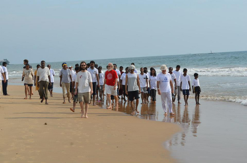 9 marca 2013 r. M.G. Satchidananda i 48 uczestników Seminarium Ciszy i Drugiej Inicjacji Krija Jogi podczas spaceru na plaży przed aśramem Zakonu Krija Jogi Babadżiego w Colombo na Sri Lance.