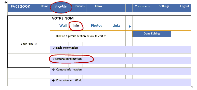 Para fazer isso: quando estiver e sua conta do FAcebook clique primeiro em “Perfil” localizado no alto da página, depois em “Infos”.